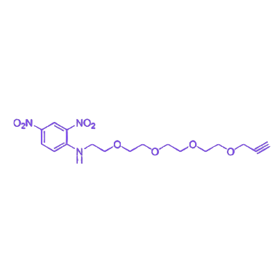 分子结构以PEG4链段为核心骨架,一端连接DNP基团,另一端修饰炔基官能团。PEG4链段的引入赋予分子优良的柔性与空间延展性,可有效减少疏水性基团间的相互作用,保障反应位点的可达性与生物体系的稳定性;DNP基团作为特异性免疫识别标签,能够与抗DNP抗体定向结合,为免疫相关研究提供分子识别基础;末端炔基则可通过CuAAC反应与叠氮修饰的生物探针、药物或纳米材料发生高效、高选择性的生物正交偶联,实现无副产物的精准连接。