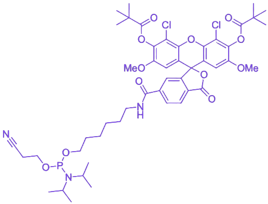 JOE phosphoramidite, 6-isomer 是通过连接臂将 6-异构体 4,5-二氯-2,7-二甲氧基荧光素(JOE)与亚磷酰胺活性基团共价结合的功能化荧光试剂,专为多通道高精度荧光检测场景中核酸探针的制备设计,具备标记准确性、光谱优势、合成兼容性及性能稳定性等核心特性。