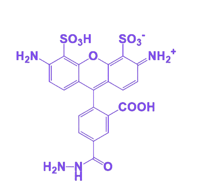 试剂分子结构中的 酰肼(Hydrazide)基团 赋予其独特的反应活性,在弱酸性条件下可与生物分子中的醛基或酮基发生特异性缩合反应,形成稳定的腙键连接。此标记过程具有 反应条件温和 的优势,可最大限度保留生物分子的天然结构与功能活性,且标记效率高、特异性强,适用于蛋白质、核酸、糖类等多种生物分子的荧光标记与示踪分析。
