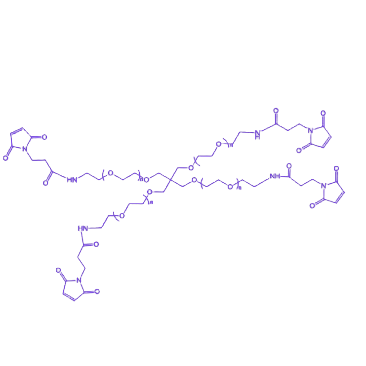 该化合物的分子结构由中心四臂核心与延伸的聚乙二醇链构成,每个臂的末端均共价连接 马来酰亚胺基团。聚乙二醇链段作为亲水性骨架,不仅提升了材料在水溶液中的分散性,还通过其柔性结构减少生物分子修饰后的空间位阻效应;而马来酰亚胺基团作为关键反应位点,可与含巯基(-SH)的生物分子发生特异性 点击化学反应,该反应具有高选择性、快速动力学及温和反应条件等特点,能够在生理环境下实现精准偶联。