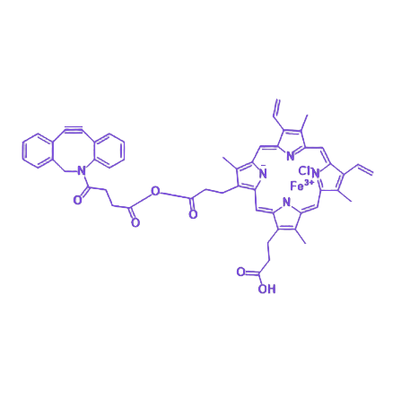 该化合物的 DBCO 结构单元赋予其高效的无铜点击化学反应活性,可与含叠氮基团的分子或生物分子发生特异性、正交化连接,反应条件温和且副产物少,适用于复杂生物体系中的定点标记与偶联。其 Hemin 组分作为铁卟啉类化合物,具有独特的光学、磁性及化学催化特性,同时保留了天然血红素参与生物氧化还原反应、电子传递及生物分子识别的潜在生物活性。