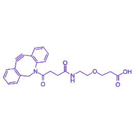 DBCO-PEG1-acid 是一种超短链 PEG 修饰的双活性点击化学试剂,其核心优势在于 PEG1 间隔臂的“空间微创性”与“适度亲水性”,以及羧基与 DBCO 的协同反应能力,广泛应用于生物偶联、药物研发、生物成像及材料科学等领域,是空间受限场景下准确偶联实验的关键工具。 该试剂分子结构中,羧基可在 EDC、DCC 等活化剂作用下,与含氨基、羟基的生物分子(如小分子药物、短肽、酶活性位点)形成稳定酰胺键/酯键,实现定向修饰;DBCO 基团能通过无铜点击化学(SPAAC 反应)与叠氮修饰分子快速反应,无需金属催化剂即可在温和条件下形成稳定三唑键,避免金属残留干扰;PEG1(单乙二醇)作为超短间隔臂,既解决了无 PEG 链试剂疏水性过强的问题,又避免了长 PEG 链导致的空间位阻,尤其适配空间受限的修饰场景(如酶活性中心、小分子药物活性位点附近)。 产品外观为白色结晶性固体,纯度≥95%,易溶于极性有机溶剂且在水相可分散,储存需严格遵循-20℃干燥密封条件,避免潮湿与反复冻融,粉末状态可稳定保存 1 年以上。包装规格涵盖 10mg、25mg、100mg 等,适配从小规模探针开发到批量合成的科研需求。 在生物偶联领域可实现小分子药物的点击标记、酶的位点特异性修饰;药物研发中可作为中间体合成靶向探针或 PROTAC 分子;生物成像领域可介导荧光染料与叠氮靶点的微创连接;材料科学中可用于纳米载体表面的致密功能化修饰。该产品仅用于科研,禁止临床或食用用途。
