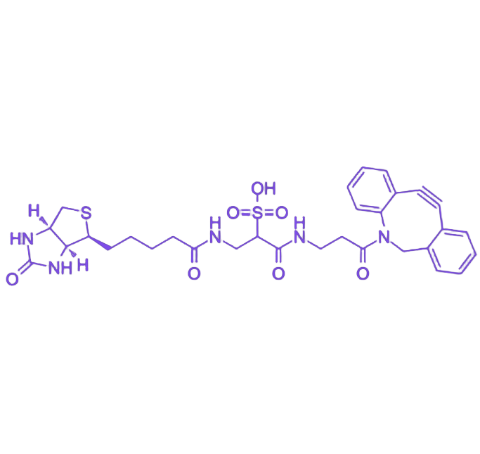 DBCO-Sulfo-Link-Biotin是一种高活性多功能化学试剂,由应变炔烃二苯并环辛炔(DBCO)活性端、亲水性Sulfo-Link spacer及生物素(Biotin)末端构成,兼具水溶性、柔性与高反应活性,适用于生物正交偶联、多功能标记及纳米材料修饰,是科研和药物研发中构建高亲和力标记体系、免疫捕获和功能化蛋白质的理想工具。 其核心结构包含三部分:DBCO环作为应变炔烃,可在无铜催化条件下与叠氮基团(–N₃)发生快速、高选择性的[3+2]环加成反应(SPAAC),实现温和且生物正交偶联;Sulfo-Link spacer提供良好的水溶性和柔性,能减小空间位阻并维持DBCO端与生物素端的合理距离,保障偶联效率和生物分子功能性;生物素末端可与亲和素(Avidin/NeutrAvidin/Streptavidin)形成高亲和力结合,用于蛋白捕获、纯化、检测和成像。 该试剂适用于蛋白质、肽、多糖、核酸及纳米材料的生物标记和功能化,DBCO端快速偶联叠氮修饰分子,Sulfo-Link spacer确保水相体系操作兼容性,无铜条件避免金属离子对蛋白质或细胞的有害影响。物理性质表现为白色或类白色粉末,易溶于水、PBS、DMSO或缓冲液。储存需注意DBCO环对光和氧敏感,应避光、干燥并低温(–20°C)密封保存,溶液状态下建议短期使用以防降解。