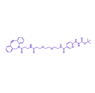该连接剂的核心功能基于各基团的协同作用:DBCO 基团可通过无铜点击化学(SPAAC 反应)与叠氮修饰生物分子高效偶联,无需金属催化剂即可形成稳定三唑键;HyNic(羟胺烟酸酯)能与醛基/酮基发生特异性肟键反应,构建第二维度的生物分子连接;Boc 保护基可在酸性条件(如 TFA 处理)下选择性脱保护,暴露氨基用于后续修饰;PEG2 链段作为柔性连接臂,既能提升水溶性与生物相容性,又能减少多基团间空间位阻,确保各反应位点独立高效发挥作用。