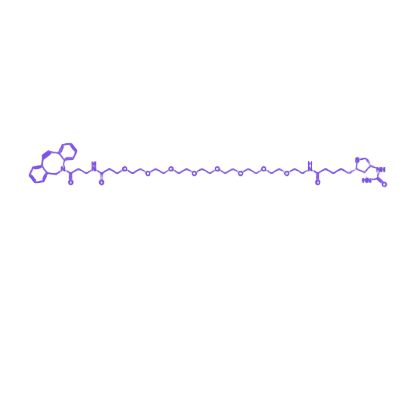 Biotin-PEG8-DBCO 是一种集成生物素高亲和力识别、PEG8柔性亲水性及DBCO高效反应活性的 无铜点击化学 核心试剂,通过特异性生物素-亲和素相互作用与高效叠氮反应,实现生物分子的精准标记与功能化。其分子结构由三部分构成:生物素(Biotin) 端提供与streptavidin或avidin的特异性结合能力,支持生物分离、传感检测及定点标记;PEG8(八聚乙二醇) 连接臂赋予分子高柔性间距与良好水溶性,可减少非特异性吸附并提升生物体系中的信号分辨率与反应效率;DBCO(Dibenzocyclooctyne) 端作为应力促进环炔结构,能在无铜、温和条件下与叠氮(–N₃)修饰底物快速反应形成稳定三唑键,避免金属催化剂对生物分子的损伤。 该试剂适用于生物素化标记、免疫偶联、细胞表面修饰、纳米材料功能化及药物递送系统构建等领域,尤其适合修饰蛋白质、抗体、核酸或聚合物载体等大分子体系。PEG8链段的较长设计确保其在复杂生物环境中仍保持高反应可达性,PEG骨架同时提升了溶液稳定性与抗非特异结合能力,保障标记反应的可控性与高保真度。可提供不同PEG间隔长度(如PEG4、PEG6、PEG12等)及端基修饰版本,满足从基础研究到产业化应用的多层次需求。