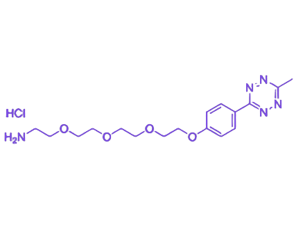 该试剂核心结构包含三大功能模块:甲基四嗪(Methyltetrazine)基团作为生物正交反应位点,可与反式环辛烯(TCO)在生理条件下发生无需催化剂的快速偶联,为活体生物分子标记、细胞表面工程等动态生物过程研究提供高效工具;聚乙二醇4(PEG4)链段通过引入亲水性和空间位阻效应,有效降低非特异性吸附,提升生物相容性,并延长分子在体内的循环时间;氨基(以盐酸盐形式存在)赋予分子良好的水溶液稳定性与溶解性,在碱性条件下游离后可与羧基、醛基等官能团发生缩合、还原胺化等反应,实现与生物分子、纳米材料或药物的精准共价偶联。