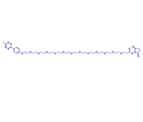 MethylTZ-PEG12-NHS 是一种具有 双功能结构 的生物正交交联剂,由甲基四嗪(Methyl Tetrazine)反应基团、NHS活性酯(N-Hydroxysuccinimide Ester)及十二单元聚乙二醇链(PEG12)构成,兼具高反应速率、低非特异性结合与良好生物相容性,适用于现代生物偶联与药物递送体系。