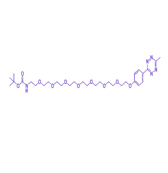 分子结构中,甲基四嗪基团可与反环辛烯(TCO)发生高效无铜点击反应,反应速率较普通四嗪快10-100倍,特异性强,适配复杂生物体系;中间的PEG8超长链相比短链PEG,水溶性与生物相容性更卓越,能形成致密“隐形”涂层,显著延长分子体内循环时间、降低免疫原性与蛋白吸附,同时提供充足柔性与空间长度以减少分子间聚集;末端的Boc(叔丁氧羰基)保护氨基可实现反应可控性,通过酸性条件(如三氟乙酸/TFA体系)脱保护后暴露游离氨基,便于进行二次官能化修饰。
