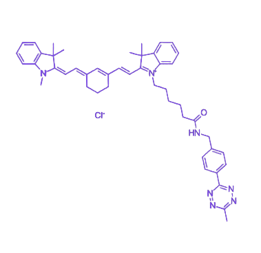 CY7-TZ的光学性能基于近红外菁染料CY7结构,发射波长约750 nm,处于700-900 nm生物组织“光学窗口”,可有效穿透5-10 mm深层组织,显著降低生物自发荧光背景干扰,避免短波长光(如FAM、CY3)对生物组织的光损伤风险。分子中的四嗪基团能与反式环辛烯(TCO)发生无铜点击反应,二级速率常数达10⁶ M⁻¹s⁻¹,反应在生理pH、室温条件下即可完成,无需催化剂,确保活生物体系内标记的准确性与生物相容性。