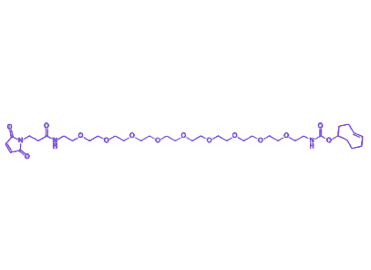 核心反式环辛烯(TCO)基团具备无催化剂、生理条件下的快速反应特性,能与四嗪(Tetrazine)类化合物发生高选择性生物正交反应,适用于活体分子标记、深层组织靶向修饰等复杂生物学场景。 聚乙二醇9(PEG9)链段 作为关键亲水性间隔臂,相较于短链PEG显著提升分子水溶性,有效降低非特异性吸附与免疫原性,延长偶联产物体内循环时间;同时通过空间缓冲效应减少对生物分子活性位点的遮蔽,尤其适配双特异性抗体、酶制剂等结构复杂大分子的功能化修饰。末端马来酰亚胺(mal)基团可特异性识别含巯基(-SH)生物分子(如半胱氨酸修饰蛋白、多肽),通过迈克尔加成反应形成稳定硫醚键,实现精准定向偶联。