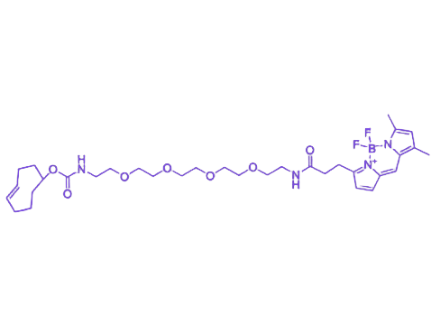 其核心结构包含三部分关键功能单元:BDP FL 作为高性能荧光基团,具备高荧光量子产率、优异光稳定性及特定激发/发射波长,可满足荧光显微镜、流式细胞术等技术对目标分子的灵敏检测与实时动态追踪需求;PEG4 链段通过增强分子亲水性与空间位阻效应,有效降低非特异性吸附,提升生物相容性,延长体内循环时间并减少免疫清除风险;TCO 基团可与四嗪类化合物发生快速、无催化剂的生物正交反应,在生理条件下即可高效完成标记,适用于活体生物分子修饰及细胞表面工程等前沿研究场景。