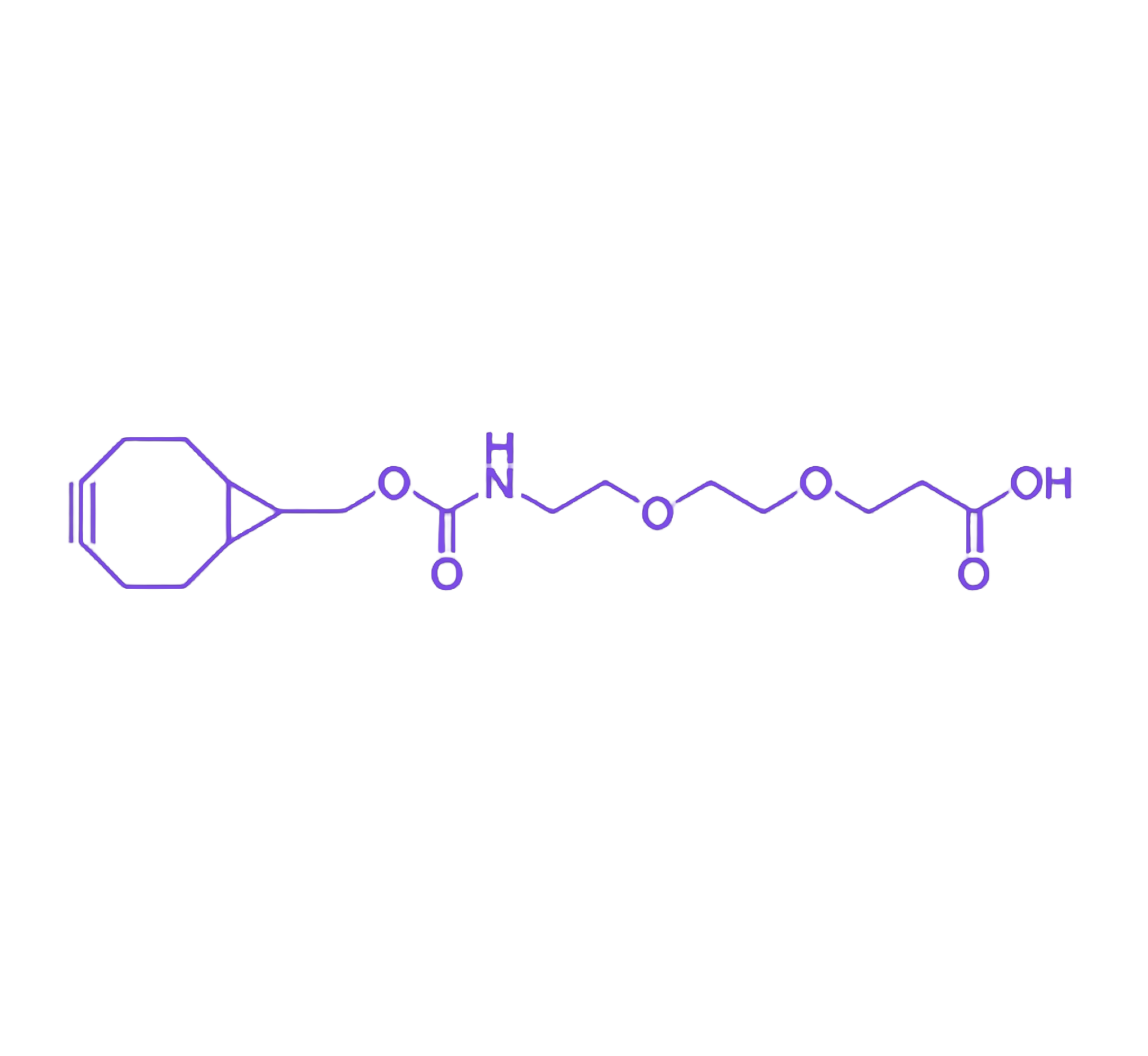 该产品外观表现为无色至淡黄色粘稠液体或白色固体粉末,纯度稳定保持在95%以上,分子式为C₁₈H₂₇NO₆,分子量353.4。其核心设计通过三组分协同实现功能突破:endo-BCN基团利用高环张力驱动无铜催化的SPAAC反应,可与叠氮基团高效偶联;PEG2连接臂(二聚乙二醇链)显著提升分子水溶性与生物相容性,延长体内循环时间;末端羧酸基团在活化剂作用下能与氨基形成稳定酰胺键,实现对生物分子的定向修饰。