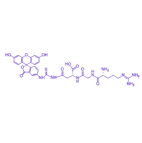 FITC-RGD是由异硫氰酸荧光素(FITC)与RGD肽偶联形成的生物活性探针,兼具RGD序列的整合素识别特性与FITC的荧光示踪功能,在生物医学研究中用于细胞黏附机制、信号传导及分子互作的可视化分析。 RGD肽由精氨酸(Arg)、甘氨酸(Gly)、天冬氨酸(Asp)组成,作为整合素受体的特异性识别位点,广泛存在于细胞外基质蛋白与血浆蛋白中,参与调控细胞-基质黏附、迁移及相关信号转导过程。FITC作为常用荧光标记物,具有高荧光量子产率与光稳定性,激发波长约495nm,发射波长约520nm,在紫外或蓝紫光激发下呈现明亮绿色荧光。 通过化学偶联将FITC标记于RGD肽,可在保留RGD生物活性的同时赋予其荧光示踪能力。该探针可借助荧光显微镜、流式细胞仪等设备,实时监测其在细胞或组织内的动态分布、代谢途径及与整合素等生物分子的相互作用,为肿瘤侵袭、血管生成、细胞极性调控等研究提供可视化技术支撑。