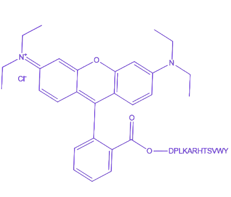 D型氨基酸构成的多肽主链赋予产品耐酶解性强生物半衰期长的特性,相较于L型多肽显著提升了体内应用的稳定性。罗丹明B通过化学偶联方式与多肽链精准结合,在保留多肽原有生物活性的同时,赋予其可通过荧光信号实时监测的能力。核心多肽序列DPLKARHTSVWY的氨基酸组成决定了其对生物体内特定受体或蛋白质的靶向结合能力,可能通过高亲和力相互作用实现特异性识别。