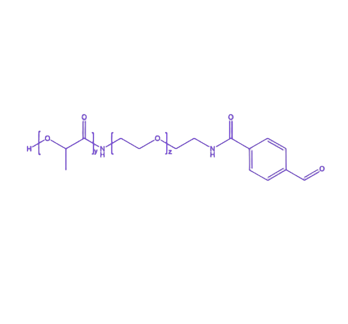 该共聚物中,PLA作为疏水性主体链段,具备优异的生物可降解性生物相容性,其分子链可在生理环境下通过水解反应逐步断裂,实现负载物的可控释放;同时,PLA的固有机械性能为材料提供了结构支撑,满足不同应用场景的物理性能需求。PEG作为亲水性修饰单元,通过引入线性或支化链段显著提升材料的水溶性胶体稳定性,并凭借其低免疫原性和生物惰性,有效降低载体系统的非特异性相互作用,优化体内循环行为。醛基(CHO)作为末端功能性基团,可通过席夫碱反应与含氨基的生物分子(如蛋白质、多肽、抗体等)进行特异性共价偶联,为材料赋予靶向识别、主动递送或生物响应等高级功能,拓展其在药物递送、组织工程及生物检测等领域的应用潜力。