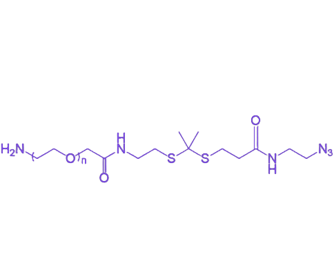 NH2-PEG-TK-N3是一种整合氨基(-NH2)、聚乙二醇(PEG)链段、酮缩硫醇(TK)及叠氮基(-N3)的多功能化合物,凭借各功能基团的协同作用,在生物医用材料及药物递送领域展现显著应用潜力。 PEG链段作为核心柔性连接单元,其亲水性与生物相容性可提升化合物水溶性并降低免疫原性,同时为其他功能基团提供空间支撑。酮缩硫醇结构具有pH响应特性,在酸性环境(pH<6)中可发生化学键断裂,为构建智能响应型递送系统提供关键触发机制。叠氮基通过点击化学反应(如CuAAC或SPAAC)实现高效共价偶联,氨基则可与羧基、醛基等进行酰胺化或席夫碱反应,双重反应位点显著拓展了化合物在生物分子修饰、靶向载体构建等复杂功能体系中的应用场景。