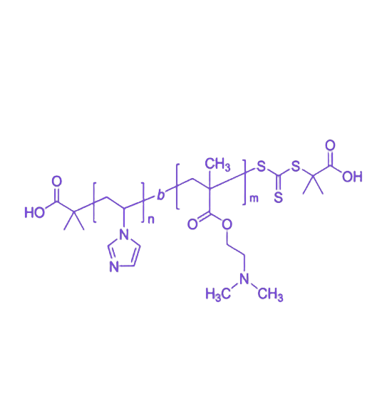 该共聚物可在水溶液中自组装形成动态可调的 胶束、囊泡或核壳结构,PNVI 作为疏水核提供稳定性,PDMAEMA 壳层则随环境变化调控胶束尺寸、表面电荷及聚集状态。基于这些特性,其主要应用于智能材料、可逆胶束体系、pH 调控界面工程、分散稳定剂、薄膜材料及纳米结构模板等领域。PDMAEMA 的可调质子化能力可用于构建 pH 可控纳米载体、智能调控乳液稳定剂及可逆吸附体系;PNVI 段使材料可扩展至高温环境、高盐体系及耐溶剂薄膜应用。此外,PDMAEMA 可进一步通过季铵化、接枝反应等化学修饰,赋予共聚物电荷调控、防污能力、刺激响应膜结构等多重功能,展现出较强的可设计性,是构建智能高分子体系的重要材料基础。