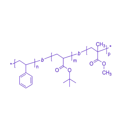 PS-b-PtBuA-b-PMMA 是由聚苯乙烯(PS)、聚叔丁基丙烯酸酯(PtBuA)与聚甲基丙烯酸甲酯(PMMA)构成的三嵌段共聚物,集成刚性、玻璃态及可转化链段的多重特性,通过三段链的协同作用在溶液自组装、膜结构构筑及纳米加工中展现独特优势,是一类具备可加工性、可修饰性与结构精细调控性的多功能材料平台。