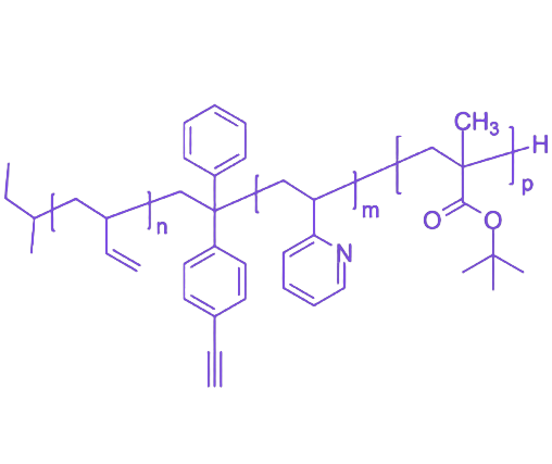 该共聚物分子结构以聚(1,2-丁二烯)(P1,2BD)为起始疏水弹性嵌段,其富含乙烯基侧链且玻璃化转变温度极低(Tg ≈-80°C),能提供聚苯乙烯(PS)所不具备的优弹性和柔韧性,悬挂的乙烯基还可作为后续硫化或氢化等反应的位点。P1,2BD 嵌段通过 4-乙炔基苯基连接桥与聚(2-乙烯基吡啶)(P2VP)嵌段相连,该连接桥赋予材料点击化学功能化能力,而 P2VP 嵌段本身具有 pH 响应和金属配位能力。分子链末端键合聚(甲基丙烯酸叔丁酯)(PtBMA)嵌段,作为可水解前驱体,其保留了水解转化为强极性聚甲基丙烯酸(PMAA)的能力。