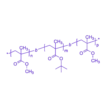 strong分子结构与组成:聚合物主链由对称分布的PMMA硬段和中间PtBMA嵌段构成,其中PMMA嵌段提供约105°C的玻璃化转变温度及优异的机械强度与光学透明度,作为材料的刚性骨架;PtBMA嵌段则通过叔丁酯基团的酸性水解反应,可转化为含羧基的聚甲基丙烯酸(PMAA),实现材料亲疏水性转变及pH响应功能。