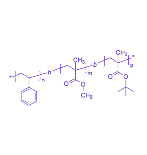 PS-b-PMMA-b-PtBMA 是一种由聚苯乙烯(PS)、聚甲基丙烯酸甲酯(PMMA)和聚甲基丙烯酸叔丁酯(PtBMA)构成的三嵌段共聚物,具备刚性支撑、界面调控及功能化修饰的多维度特性,其独特的链段组合与相分离行为使其成为可编程纳米材料骨架,在纳米图案化、智能响应及功能界面设计等领域展现出显著应用潜力。