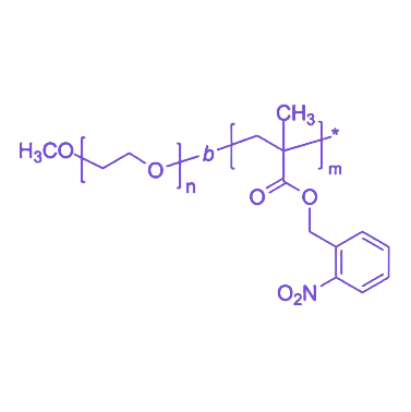 Poly(ethylene oxide)-b-poly(nitrobenzyl methacrylate)(PEO-b-PnBMA)是一种具备精准光响应特性的双亲性嵌段共聚物,其分子结构由亲水性聚环氧乙烷(PEO)链段与含光敏基团的聚(硝基苄基甲基丙烯酸酯)(PNBMA)链段构成。该材料的核心功能源于PNBMA链段中的邻硝基苄基酯基团,在300-365 nm紫外光照射下可发生高效光解反应,生成硝基苯副产物及亲水性聚甲基丙烯酸(PMAA)链段,这种光化学转变能够显著改变材料的亲疏水平衡,进而触发纳米结构的重组或解体。 在药物递送领域,PEO-b-PnBMA可自组装形成包载药物的纳米胶束,光照前胶束结构保持稳定,光照后PNBMA嵌段转化为亲水的PMAA,导致胶束解体并释放药物。此 光触发机制 具有高度时空控制精度,能够实现药物的定点定时释放,与pH或温度响应系统相比,具有非侵入性、快速响应及准确操控的显著优势。此外,该材料在光图案化表面、智能涂层及光控分子器件等领域亦展现出广阔的应用前景。