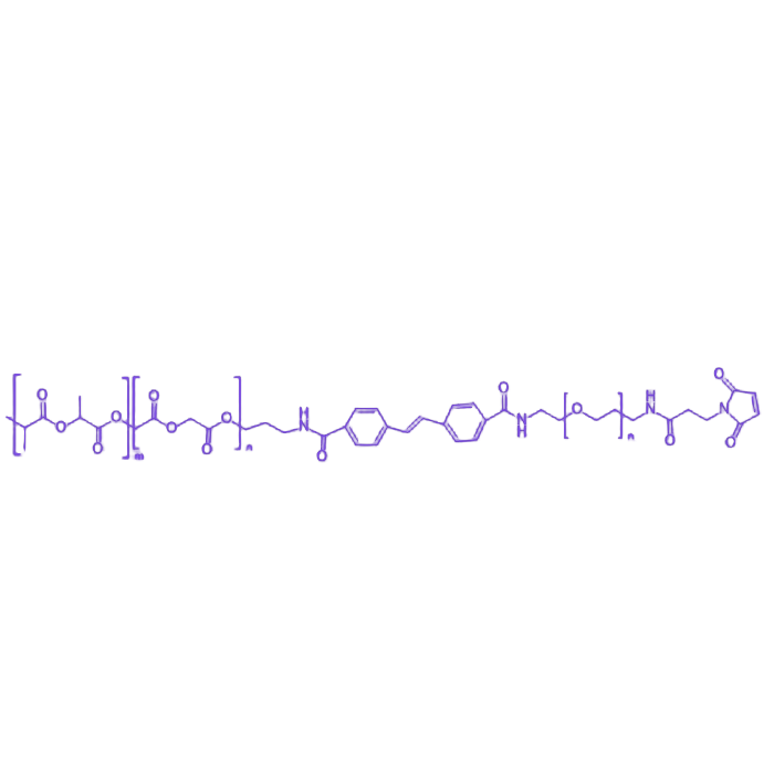 PLGA-Azo-PEG-MAL 是一类整合了生物可降解性、刺激响应性、亲水性及生物偶联功能的多功能聚合物材料,其分子结构由 PLGA(聚乳酸-羟基乙酸共聚物)、Azo(偶氮苯)、PEG(聚乙二醇)和 MAL(马来酰亚胺)基团依次连接构成,适用于生物医用领域的药物递送、分子识别及控释系统构建。 该材料的核心组分 PLGA 由乳酸与羟基乙酸随机共聚形成,具备优异的生物相容性和生物可降解性,无毒性,且成囊、成膜性能良好;通过调整乳酸与羟基乙酸的单体比例,可精准调控其降解速率,满足不同应用场景的需求。Azo(偶氮苯)结构作为刺激响应单元,可能通过光致异构等特性赋予材料光学调控能力或分子识别功能,为环境响应型释放系统提供基础。PEG 链段作为亲水性修饰单元,能在材料表面形成稳定的水化层,有效提升生物相容性并延长其在生物体内的循环时间,减少非特异性清除。MAL(马来酰亚胺)官能团则提供高效的生物偶联位点,可与含巯基的生物活性分子(如抗体、肽段、酶等)发生特异性共价结合,实现靶向分子的精准负载与可控释放,拓展材料在疾病诊断与治疗中的应用潜力。