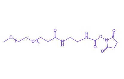 mPEG-SC作为一类重要的聚乙二醇衍生物,通过将甲氧基聚乙二醇的亲水性与生物相容性优势,与琥珀酰亚胺碳酸酯基团的高反应活性相结合,在生物医学领域展现出关键应用价值。其结构设计使其既能有效降低生物体内的免疫原性、延长循环时间并提升分散性,又能通过特异性共价偶联反应实现对生物分子、药物及生物材料的精准修饰与功能化。 甲氧基聚乙二醇赋予mPEG-SC优异的生物学特性,包括良好的亲水性和生物相容性,可显著降低材料在生物体内的免疫原性,延长其血液循环时间,并提升在复杂生物体系中的分散稳定性。这一特性使其在药物递送系统中能有效减少非特异性清除,提高药物生物利用度。 琥珀酰亚胺碳酸酯基团作为高反应活性功能单元,可与生物分子(如蛋白质、多肽、抗体等)表面的氨基发生特异性共价偶联反应,形成稳定的酰胺键连接。该反应具有高效性和选择性,能够在温和条件下实现生物分子的定点修饰,确保修饰后生物分子的结构与活性完整性。 基于上述特性,mPEG-SC广泛应用于生物医学领域的多个方向:在药物修饰中,可通过偶联药物分子实现长效化与靶向递送;在生物材料表面改性中,能提升材料的血液相容性与生物活性;在生物分子固定化中,可用于构建高性能生物传感器或诊断试剂,助力实现对生物分子的准确操作与功能调控。