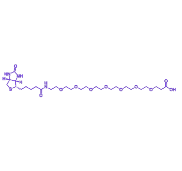 Biotin-PEG7-COOH(生物素-聚乙二醇7-羧基)是一种线性杂双功能试剂,由生物素、7个乙二醇单元组成的聚乙二醇链(PEG7)及羧基(-COOH)构成。其核心特性包括生物素与亲和素/链霉亲和素的超高亲和力结合能力,异双功能性介导的定向偶联,PEG链赋予的水溶性提升,以及PEG7链长设计实现的空间位阻效应优化。 生物素基团可与亲和素或链霉亲和素以近乎不可逆的高特异性结合,实现非共价聚乙二醇化;PEG7链段作为亲水性间隔臂,在保持分子柔性的同时,为生物素与目标分子间提供适宜距离,减少空间位阻对结合活性的影响;羧基则具备可调节反应性,能与含胺基生物分子(如蛋白质、抗体、核酸等)发生共价偶联。 该试剂通过整合生物素-链霉亲和素系统的特异性识别与PEG的生物相容性优势,适用于生物分子的定向修饰、靶向递送及分析检测等场景,可在生理缓冲液中高效进行分步偶联反应,确保偶联物的结构稳定性与功能活性。