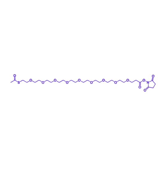 分子式为C27H47NO14S,产品形态为白色粉末,纯度≥95%,易溶于极性有机溶剂,在水相反应中需控制pH在7.0-8.0范围内并合理调整反应时间。一端的乙酰硫基(AcS-)可在温和条件(如含三乙胺的无水缓冲液)下脱保护生成巯基,实现与马来酰亚胺、乙烯砜等基团的特异性偶联;另一端的NHS酯基团能快速与氨基(-NH₂)反应,无需额外活化剂即可形成稳定酰胺键。