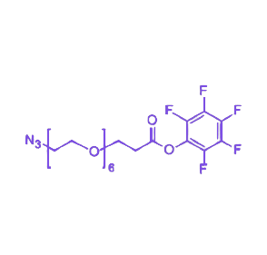 该化合物的核心结构包含-N₃(叠氮基),作为点击化学的关键反应基团,可通过铜催化或无铜环加成与炔烃、环辛炔等快速形成稳定共价键,反应条件温和且选择性高,有效避免生物分子活性损失。PEG6 链段(-(OCH₂CH₂)₆-)赋予分子优异的水溶性生物相容性,同时通过柔性链结构减少空间位阻,显著提升修饰效率。末端五氟苯基(PFP)作为强吸电子离去基团,可在温和条件下与胺、醇等亲核试剂反应,高效生成稳定的酰胺键酯键,适用于蛋白质、抗体及表面配体的定点修饰。