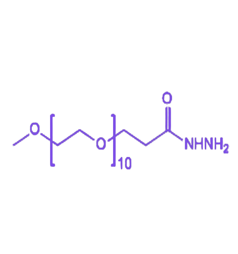 分子结构中,一端为稳定的甲氧基(-OCH₃),提供化学惰性以避免非特异性反应;另一端为高活性的酰肼基团(-CONHNH₂),可在温和条件下与醛基或酮基发生缩合反应,形成稳定的腙键结构,为靶向修饰提供关键反应位点。中间由含10个乙二醇单元的聚乙二醇链连接,赋予分子优异的水溶性生物相容性,能有效降低非特异性吸附,提升材料在生物体系中的稳定性与安全性。