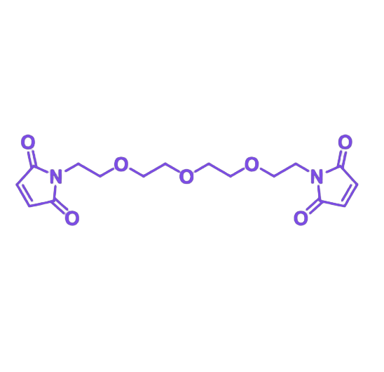 化学结构:分子两端为马来酰亚胺活性基团,中间通过由3个乙二醇单元(-O-CH₂-CH₂-)构成的PEG3链连接,整体呈现对称的线性分子结构。