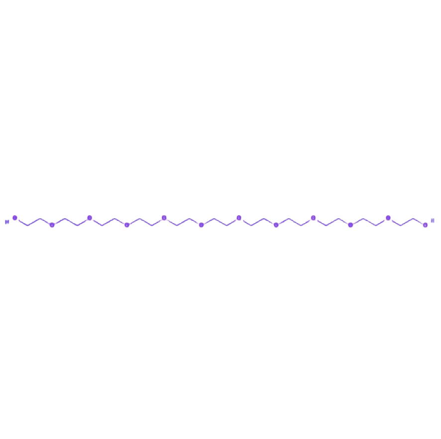 PEG12是由12个乙二醇单元通过醚键连接形成的聚乙二醇衍生物,其分子结构中丰富的醚键和羟基赋予良好水溶性与化学反应活性,较长的分子链使其在调节化合物释放、改善材料表面性质等方面具备独特应用价值。 <强>化学组成与分子结构强>:由12个乙二醇(HO-CH₂CH₂-OH)单元通过醚键(-O-)线性连接构成,分子式可表示为HO-(CH₂CH₂O)₁₂-H,分子量约为550-580 g/mol。分子两端的羟基(-OH)为主要反应位点,可参与酯化、醚化等化学反应。 <强>物理性质强>:常态下为无色至淡黄色液体或半固体,无臭或略带特殊气味;具有优异的水溶性,可与水以任意比例混溶,同时易溶于乙醇、丙酮、二氯甲烷等多种有机溶剂;挥发性低,沸点较高(通常>250℃),在常温下不易挥发。 <强>化学特性强>:具备聚乙二醇类化合物的典型化学稳定性,在常规储存和使用条件下(常温、中性pH)不易分解或变质;但在极端条件下(如高温>200℃、强酸/强碱环境)可能发生醚键断裂导致降解,羟基基团可通过化学反应进行功能化修饰。 <强>应用特性强>:分子链长度适中,兼具亲水性与柔韧性,在药物递送系统中可调节活性成分的释放速率,在材料科学领域能改善聚合物表面的亲水性和生物相容性,在化妆品配方中可作为保湿剂和溶剂,在涂料工业中可用作增塑剂或流平剂。