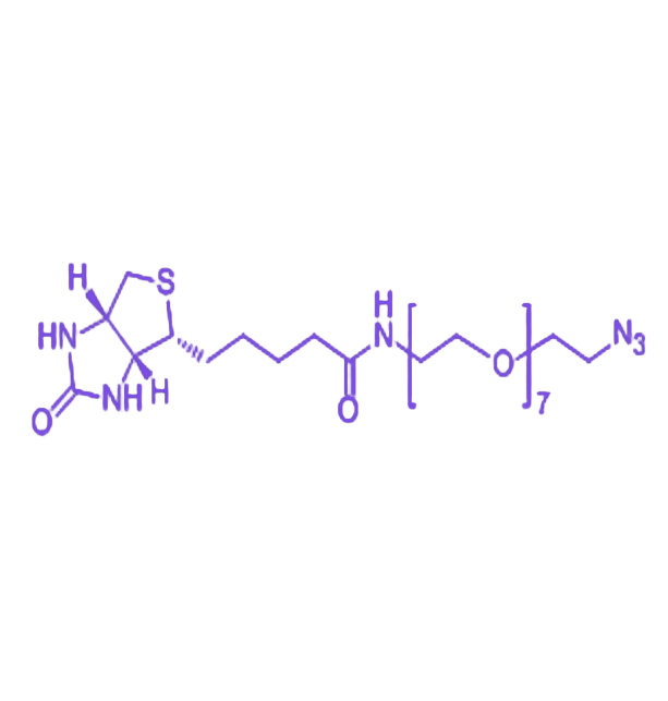 该分子的核心结构包含三个关键功能模块:生物素作为靶向识别单元,可与链霉亲和素或卵白素形成自然界最强的非共价键结合之一,为生物分子标记、分离与检测提供高特异性识别基础;PEG7 链段作为连接臂,显著提升分子的水溶性与生物相容性,有效降低免疫原性及非特异性吸附,同时增强水相环境中的操作稳定性与便捷性;叠氮基团(N3)作为反应活性位点,可在温和条件下通过铜催化的点击化学(CuAAC)或无金属催化的应变促进炔叠氮环加成反应(SPAAC),与炔基高效偶联生成稳定的 1,2,3-三唑结构,实现分子的精准定向修饰。