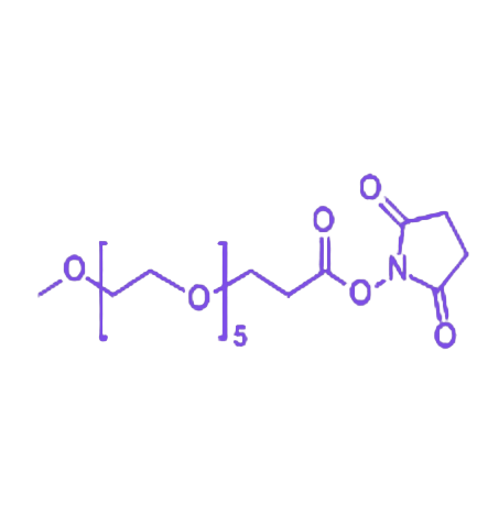 mPEG5-SPA(甲氧基聚乙二醇 5 琥珀酰亚胺丙酸酯)是一类具有明确结构与功能特性的聚乙二醇衍生物,其分子设计整合了惰性末端、亲水性链段与生物活性位点,在生物医学及材料科学领域展现出独特的应用价值。 该化合物的分子结构由三部分构成:一端为化学性质稳定的甲氧基(-OCH₃),可有效避免储存及反应过程中的非特异性副反应;中间链段由5个乙二醇单元组成,赋予分子优异的亲水性,使其可溶于水及 DMSO、DMF 等极性有机溶剂;另一端的琥珀酰亚胺丙酸酯(SPA)基团作为核心活性位点,能够与蛋白质、多肽等生物大分子的氨基发生特异性共价结合。 作为一种高效的生物分子修饰工具,mPEG5-SPA 通过 PEG 化修饰可显著改善生物分子的理化性质与生物学功能。修饰后的生物分子在保留固有活性的基础上,其体内循环半衰期得以延长,免疫原性降低,稳定性增强,为药物研发中的长效制剂开发、生物成像中的探针标记以及细胞培养体系的优化提供了关键技术支撑。