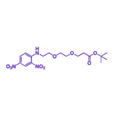 DNP-PEG2-COOtBu 是一种整合了2,4-二硝基苯基(DNP)发色团、聚乙二醇2(PEG2)连接臂和叔丁酯(COOtBu)保护基的多功能分子工具,其设计旨在满足精准合成与功能调控需求,通过模块化结构实现光谱追踪、极性调节及酸触发官能团转化的协同作用。 分子一端的DNP基团作为强紫外吸收发色团,不仅提供可直接检测的光谱信号,还具备光化学或还原条件下的转化潜力,为反应过程监控和后续功能激活提供可能性。中间的PEG2链段由两个乙二醇单元组成,作为极性连接臂有效分隔两端功能基团,同时引入适度亲水性与分子柔顺性,优化化合物在不同溶剂体系中的分散性及与生物分子的相容性。末端的叔丁酯保护基则赋予羧酸基团酸敏特性,可在酸性条件下选择性脱除,定量释放游离羧酸官能团,为后续偶联反应或功能修饰提供活性位点。 该化合物可作为带光谱标记的保护基化合成砌块,用于多步合成中实现可控的官能团转化;其结构特性也使其适用于构建含DNP标记与可衍生化羧酸的复杂分子前体,在生物偶联、材料表面修饰及药物递送系统等领域具有潜在应用价值。