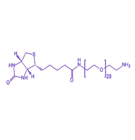 Biotin-PEG23-NH2(生物素二十三聚乙二醇氨基)是一种具有生物识别能力、亲水性与化学偶联性能的功能性化合物,CAS号2243569-24-6,分子式C54H106N4O22S,分子量1163.49,其分子结构由生物素基团、PEG23长链片段及末端氨基构成,为生物材料修饰和药物递送系统构建提供关键工具。 分子中的生物素基团可与链霉亲和素及其同源蛋白形成超高亲和力结合,结合常数达10¹⁵ M⁻¹,这种特异性相互作用确保了生物分子在固定、标记及富集过程中的选择性识别,有效提升复杂样品检测的灵敏度与准确性。PEG23长链的引入是该化合物的核心优势,相较于短链PEG修饰,其不仅显著增强分子水溶性,更能通过立体屏障效应减少非特异性蛋白吸附,降低背景噪音并改善检测信噪比;同时,长链PEG结构可延长分子在生物体内的循环时间,减少网状内皮系统的快速清除,适用于长效纳米药物载体构建及体内成像研究。末端氨基(-NH₂) 作为关键化学修饰位点,可与羧基、醛基、活性酯等多种官能团发生共价偶联反应,实现与多肽、蛋白质、核酸、纳米颗粒或聚合物材料的稳定结合,从而赋予目标体系新的功能特性。