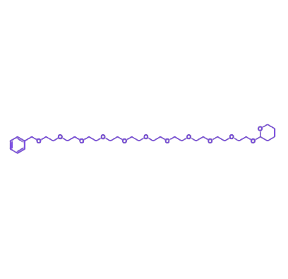 分子结构由三个协同作用的精密单元构成:苄基作为化学稳定基石,确保分子整体惰性与储存稳定性,同时提供通过催化氢解实现的正交脱保护或功能化路径,为构建非对称或刺激响应型智能分子提供双重设计维度;十聚乙二醇(PEG10)超长链作为核心间隔臂,在短链PEG优势基础上,将亲水性、水合层厚度、空间隔离能力及构象自由度推向新高峰,能为修饰对象提供接近理论极限的“隐形”保护,近乎完全抵抗蛋白质非特异性吸附和免疫系统识别;四氢吡喃(THP)作为可逆保护基团,可在温和酸性条件下efficient脱除,实现从稳定前体到高反应活性伯羟基的准确、瞬时转化。
