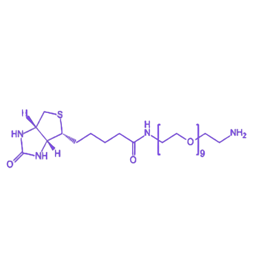 Biotin-PEG9-NH2(生物素九聚乙二醇氨基)是一种由生物素、九聚乙二醇链(PEG9)和伯氨基(-NH2)组成的功能性分子探针,其结构设计融合了生物素的特异性识别能力、PEG链的亲水性及生物相容性,以及氨基的高反应活性,在生物医学研究与材料表面功能化领域具有重要应用价值。