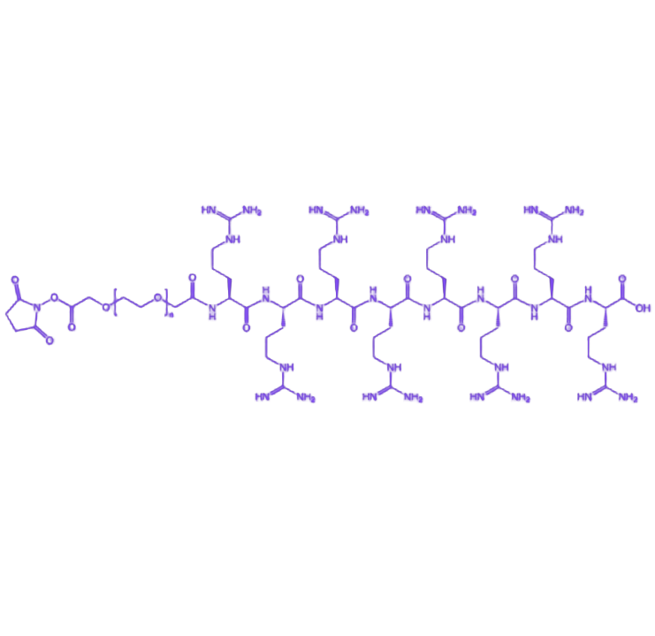 R8(八聚精氨酸)是由八个连续精氨酸残基组成的阳离子型短肽序列,具有极强的细胞穿透能力。其作用机制主要通过与细胞膜表面带负电荷的磷脂或特定受体发生静电相互作用及受体介导的内吞作用,辅助整个偶联分子高效跨越细胞膜屏障进入细胞内部,这一特性使NHS-PEG-R8在细胞内药物递送、荧光成像探针构建及生物活性分子胞内转运等应用场景中展现出独特优势。