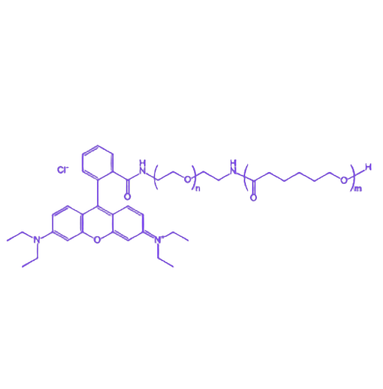 RB-PEG-PCL是一种由罗丹明B(RB)、聚乙二醇(PEG)和聚己内酯(PCL)通过化学偶联形成的功能性嵌段共聚物,兼具荧光示踪、生物相容性及药物控释等复合特性,在生物医用材料领域具有重要应用潜力。 罗丹明B(RB)作为荧光标记单元,具有稳定的红色荧光发射特性(激发与发射波长固定),可通过荧光成像技术实时追踪聚合物在生物体系中的分布与代谢过程,为药物递送路径可视化提供关键支持。聚乙二醇(PEG)片段赋予聚合物优异的亲水性和生物相容性,能有效提升其在水溶液中的分散性,同时通过“隐形效应”降低单核-巨噬细胞系统的识别与清除,显著延长体内循环时间。聚己内酯(PCL)作为可生物降解聚酯链段,具备适宜的机械强度和可控降解速率(可通过调节分子量及结晶度实现),其疏水腔体可高效包载疏水性药物或生物活性分子,通过材料降解过程实现负载物的缓慢、持续释放,减少给药频率并降低毒副作用。三者的协同作用使RB-PEG-PCL成为集荧光示踪、长循环及可控释药功能于一体的多功能纳米载体材料。