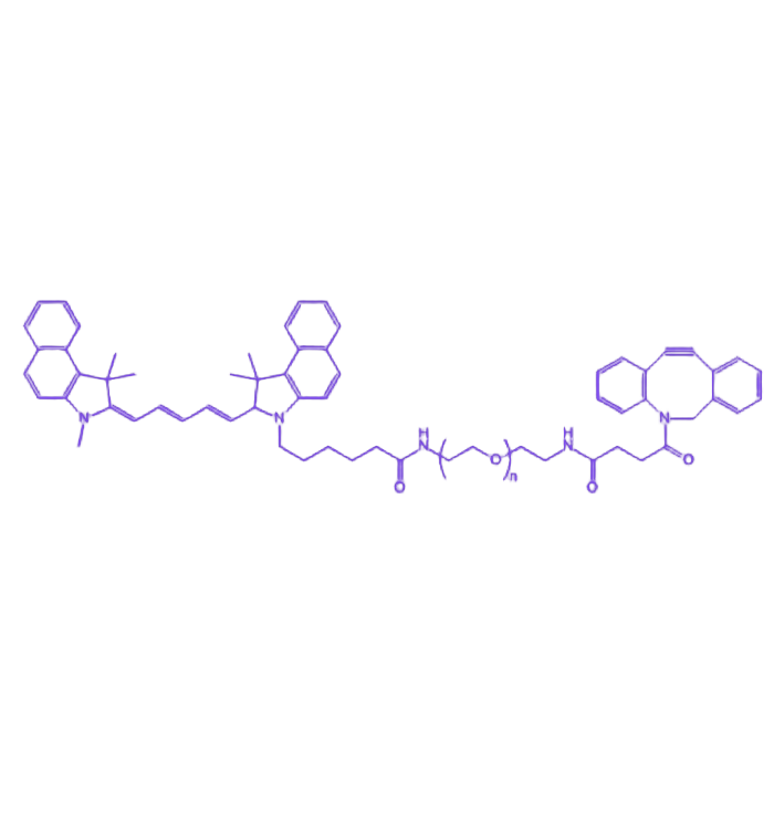 Cy5.5-PEG-DBCO 是一种集成 Cy5.5 荧光染料、聚乙二醇(PEG) 与 二苯基环辛炔(DBCO) 基团的功能化近红外荧光分子,兼具高荧光性能、生物相容性及化学偶联活性,广泛用于生物标记、分子偶联及活体成像等科研场景。 Cy5.5 荧光染料作为核心发光单元,具有约 675nm 激发波长与 695-720nm 发射波长,荧光强度高且光稳定性优异,可满足深组织成像需求。PEG 修饰链通过提升分子水溶性与生物相容性,有效降低非特异性吸附,增强其在生物体系中的适用性。DBCO 活性基团可与叠氮化合物发生高效无铜点击反应,在温和条件下实现快速、特异性分子偶联,适用于复杂生物环境中的精准标记。 该产品外观为固体或粘性液体,具体形态取决于 PEG 分子量差异;溶剂兼容性良好,可溶于水及二氯甲烷(DCM)、二甲基甲酰胺(DMF)等有机溶剂。为确保性能稳定,储存需满足 -20℃ 干燥、避光条件,避免光照与高温导致荧光淬灭或化学结构降解。