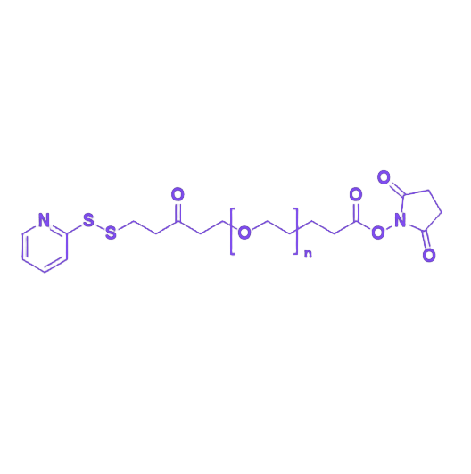 该分子结构中,邻二硫吡啶基团(OPSS)可与巯基(-SH)发生特异性交换反应,形成稳定的二硫键,实现靶向偶联;琥珀酰亚胺戊酸酯(SVA)作为N-羟基琥珀酰亚胺(NHS)酯类衍生物,能高效活化羧基,与伯胺基团(-NH₂)在温和条件下反应生成酰胺键。聚乙二醇链段的引入可有效改善修饰后生物分子的水溶性、稳定性及生物相容性,降低免疫原性。该产品适用于蛋白质、多肽、抗体及纳米颗粒等生物活性物质的定点修饰,在构建靶向药物载体、制备抗体偶联药物(ADC)及生物分子功能化研究中展现出优异的应用性能。