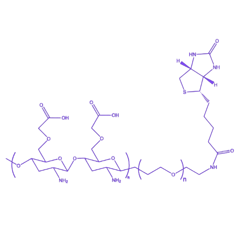 CMCS-PEG-biotin(羧甲基壳聚糖-聚乙二醇-生物素)是一种通过化学偶联技术制备的多功能生物医用复合材料,兼具天然高分子的生物相容性与合成聚合物的结构可调控性。该材料通过精准的分子设计实现了羧甲基壳聚糖主链与生物素靶向基团的高效连接,为生物活性分子固定化及靶向递送提供了理想载体。