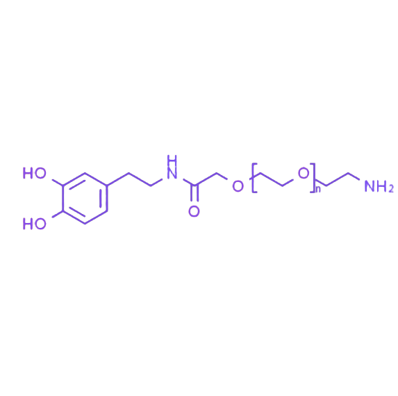 该化合物的分子结构以线性PEG链为亲水性骨架,一端通过酰胺键连接多巴胺分子,另一端则修饰有自由氨基基团。这种结构设计赋予产品三重核心特性:多巴胺单元可通过儿茶酚基团实现与多种无机/有机材料表面的 非共价锚定,PEG链段提供优异的 生物相容性 与空间位阻效应,而末端氨基则可作为活性位点,通过与羧酸、NHS酯等基团的化学反应实现进一步功能化修饰。其典型外观为白色至类白色粉末或粘稠液体,在水及常用有机溶剂中具有良好溶解性,分子质量可根据PEG链长调控(通常涵盖500-10000 Da范围),且具有良好的化学稳定性与储存寿命。在应用层面,该产品可作为表面改性剂构建生物功能化涂层,通过多巴胺的粘附特性实现材料表面的快速功能化;也可作为连接子用于药物分子、荧光探针或纳米颗粒的偶联,利用PEG的“隐形”特性减少生物系统识别与清除,同时通过氨基的反应活性实现靶向配体的定点偶联,在可控药物释放、生物成像及组织工程等领域展现出独特的技术优势。
