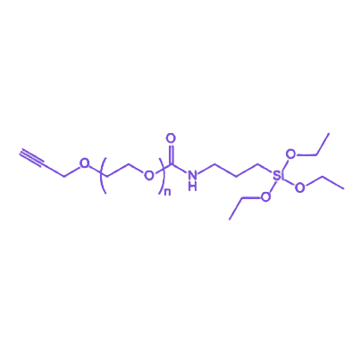 该化合物分子结构中,线性聚乙二醇(PEG)链段作为连接桥,一端共价键合反应性炔基(-C≡CH),另一端修饰有硅烷(-Si(OR)₃)基团。这种双功能设计赋予其独特物化性质:PEG链段提供良好的水溶性、生物相容性及空间位阻效应,硅烷基团可通过水解缩合反应实现与羟基化表面(如玻璃、二氧化硅、羟基磷灰石等)的稳定共价连接,而炔基则能通过点击化学反应(如Cu(I)催化的Azide-Alkyne环加成反应)高效偶联含叠氮基的生物分子或功能单元。其分子量可根据应用需求定制,通常呈现为白色至浅黄色固体粉末或粘稠液体,在有机溶剂中具有良好溶解性。在应用层面,该产品可广泛用于制备功能化表面涂层、构建靶向药物递送系统、修饰纳米粒子及生物传感器等,为材料表面功能化与生物分子偶联提供了高效、可控的化学工具。