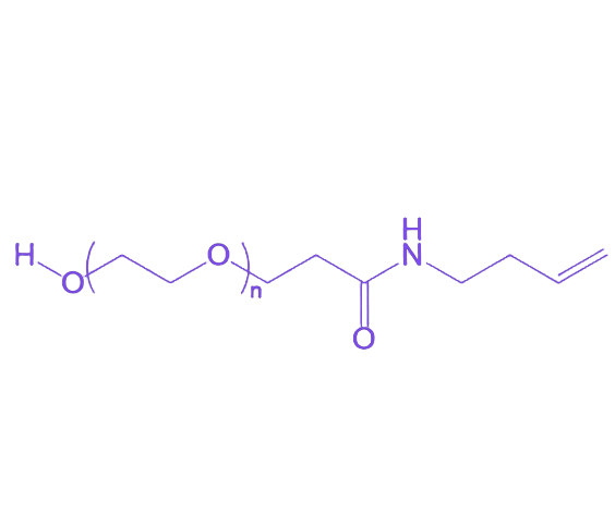 该产品的分子结构以聚乙二醇(PEG)为主链,一端为亲水性的羟基基团,可通过酯化、醚化等反应进一步衍生化;另一端为疏水性的烯烃基团,能够通过点击化学(如巯基-烯加成反应)高效偶联含巯基的生物分子(如蛋白质、多肽)或载体材料。其物化性质表现为良好的水溶性与生物惰性,在水相体系中可稳定分散,且具有较低的免疫原性与蛋白吸附能力。得益于双官能团协同效应,OH-PEG-alkene可作为桥梁分子实现生物活性分子与聚合物载体的精准偶联,在构建靶向药物递送系统、制备刺激响应型水凝胶及表面功能化涂层等方向展现出独特优势,为生物材料的功能设计提供了高效且可控的化学工具。