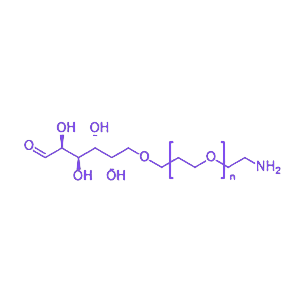 该化合物的分子结构以线性聚乙二醇(PEG)为主链,一端通过共价键连接半乳糖残基,另一端修饰有氨基(-NH₂)活性基团,这种双亲性结构可有效平衡材料的水溶性与生物靶向性。在物化性质方面,产品表现出良好的亲水性和稳定性,在生理pH条件下可保持结构完整,且通过调节PEG链段分子量可灵活调控材料的水合动力学半径与生物分布行为。作为糖基化修饰试剂,其半乳糖单元能特异性识别细胞表面的半乳糖受体,实现药物或载体的主动靶向递送;同时,末端氨基可与羧基、活性酯等基团发生高效偶联反应,用于蛋白质、多肽及纳米颗粒的功能化修饰,在肿瘤靶向治疗、分子成像及生物传感等领域具有重要应用价值。