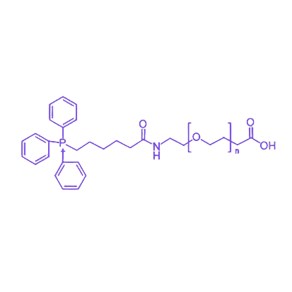 该分子通过三苯基膦基团与聚乙二醇链的稳定连接,形成具有明确拓扑结构的 amphiphilic 嵌段分子。其独特的 双亲性结构 赋予材料优异的水分散性与细胞膜穿透能力,其中三苯基膦作为线粒体靶向基团可特异性富集于高膜电位细胞器,而末端羧基则为后续生物分子偶联(如蛋白、多肽或药物分子)提供活性位点。在物化性质方面,该化合物表现出良好的化学稳定性与可调控的分子量分布,通过改变聚乙二醇链长可灵活调节其亲疏水平衡及生物半衰期。在应用层面,其在线粒体靶向药物递送、亚细胞水平成像探针及生物共轭材料制备中展现出显著优势,尤其适用于需跨越细胞膜屏障的精准治疗体系构建。